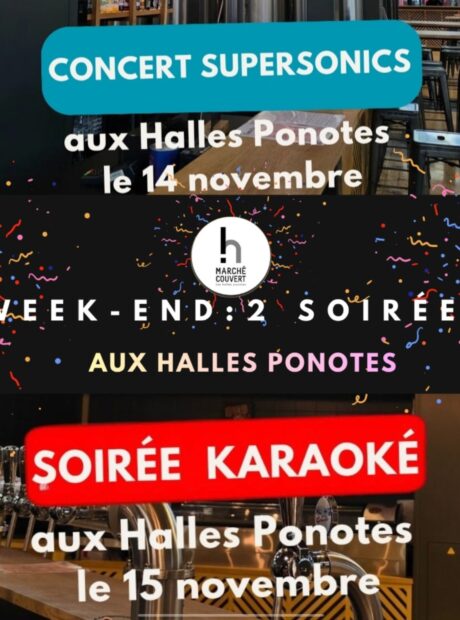 Préparez-vous pour un week-end : 2 soirées exceptionnel aux Halles Ponotes ! Deux soirées festives vous attendent au Marché Couvert du Puy-en-Velay : le vendredi 14 novembre, vibrez au rythme du concert Supersonics, puis poursuivez la fête le samedi 15 novembre avec une grande soirée karaoké NRJ pleine de bonne humeur et de musique. Ambiance conviviale, moments partagés et surprises vous garantissent un week-end inoubliable au cœur du Puy-en-Velay !